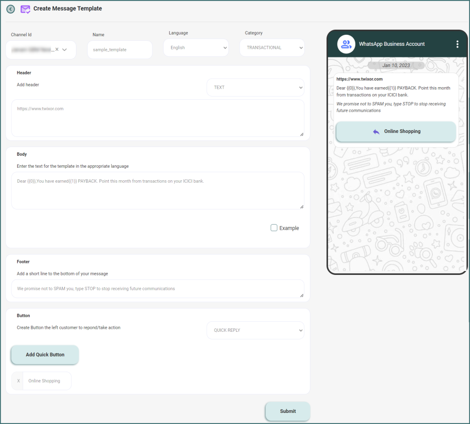 10. After filling out all the information, click Submit to save the Message Template.