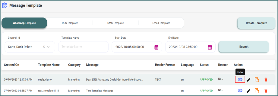 After configuring your WhatsApp channel, you can view the list of templates created using the Channel Id.